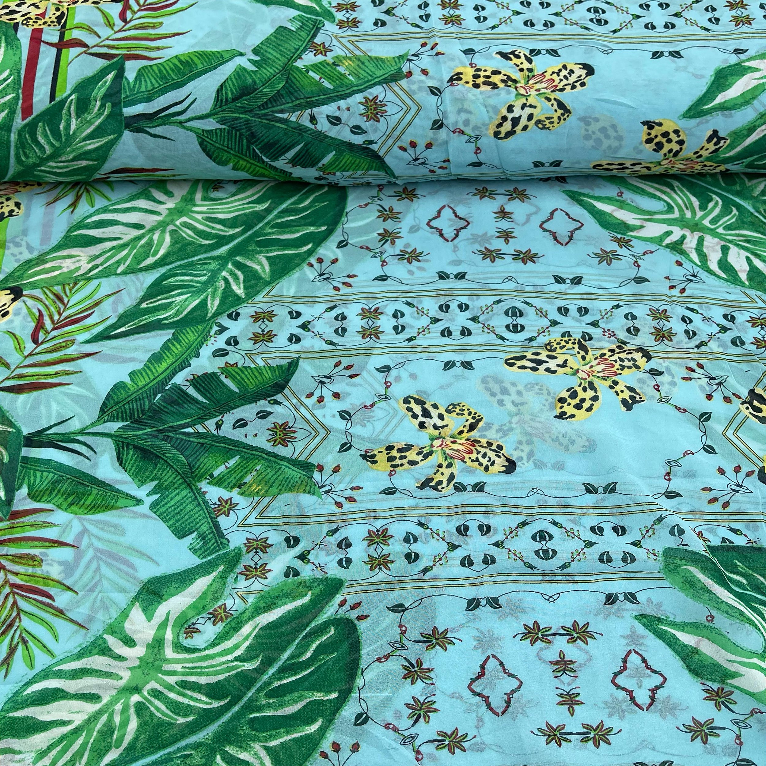 O crepe estampado é um tecido leve e fluido, conhecido pela sua textura granulada e caimento suave. Feito a partir de fibras de poliéster, esse tecido oferece durabilidade, resistência a rugas e facilidade de manutenção, sendo uma excelente opção para peças de roupa que não amassam com facilidade. As estampas vibrantes e diversificadas são impressas com precisão no tecido, garantindo cores vivas e duradouras. Comumente utilizado em roupas femininas, como vestidos, blusas e saias, o crepe de poliéster estampado proporciona um visual elegante e confortável, ideal tanto para o dia a dia quanto para ocasiões mais formais.