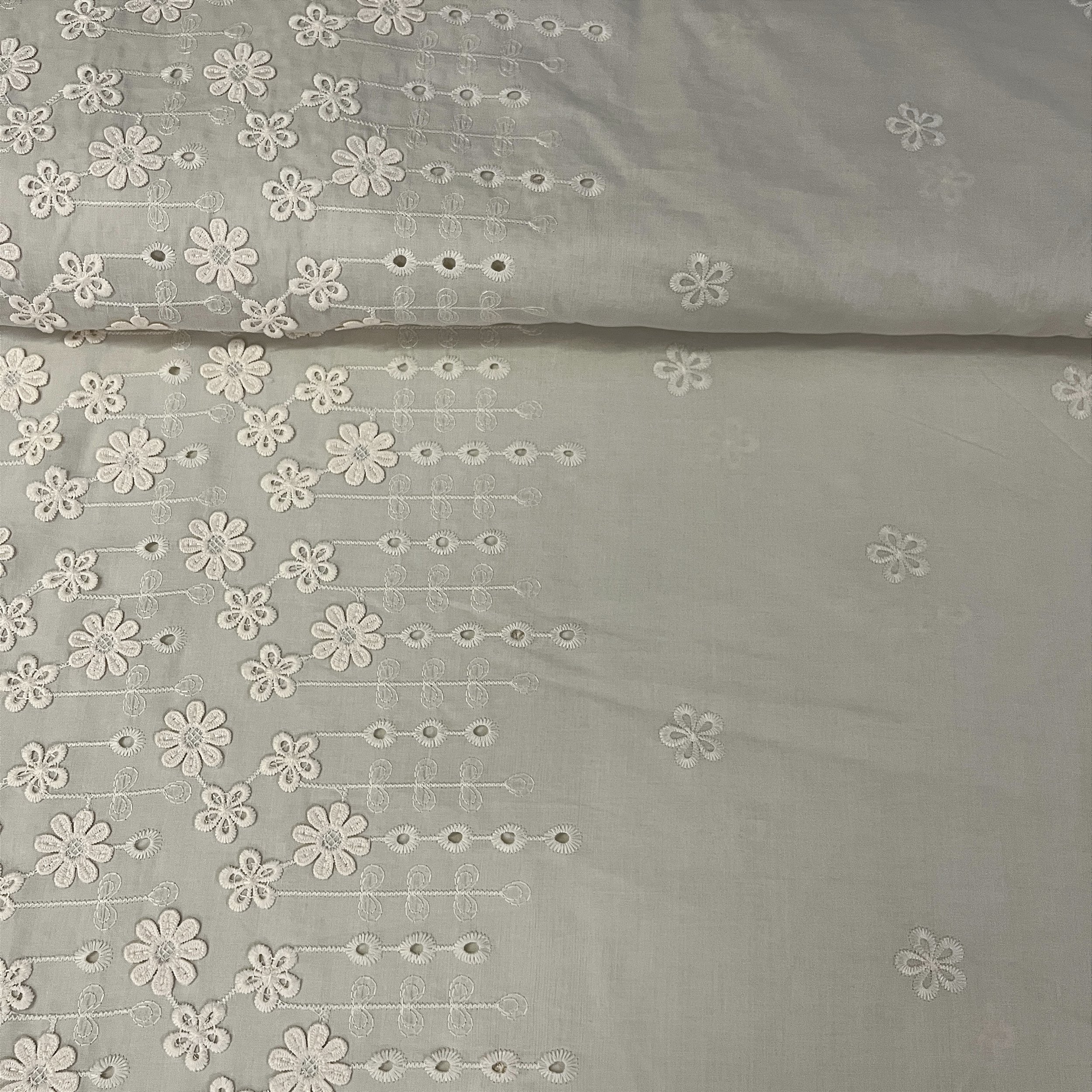 A Laise Bordada Barrada 3D é um material composto de Algodão tem como característica a superfície vazada e bordada, Dá uma estética romântica às suas peças. Além da possibilidade de uso pode ser aproveitada também para decoração, fronhas e lençóis.