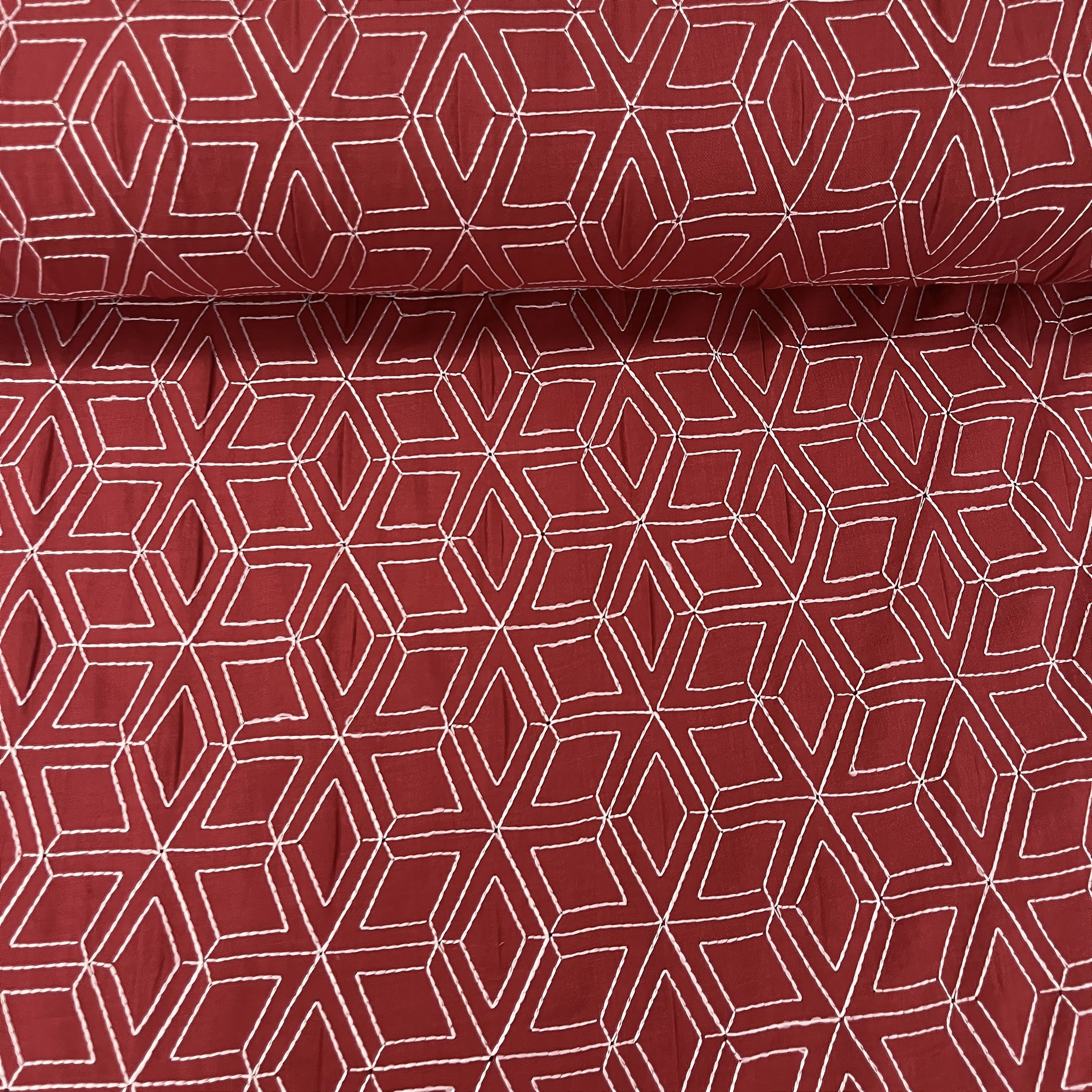 Linho com Viscose Bordado Vermelho Geométrico Branco