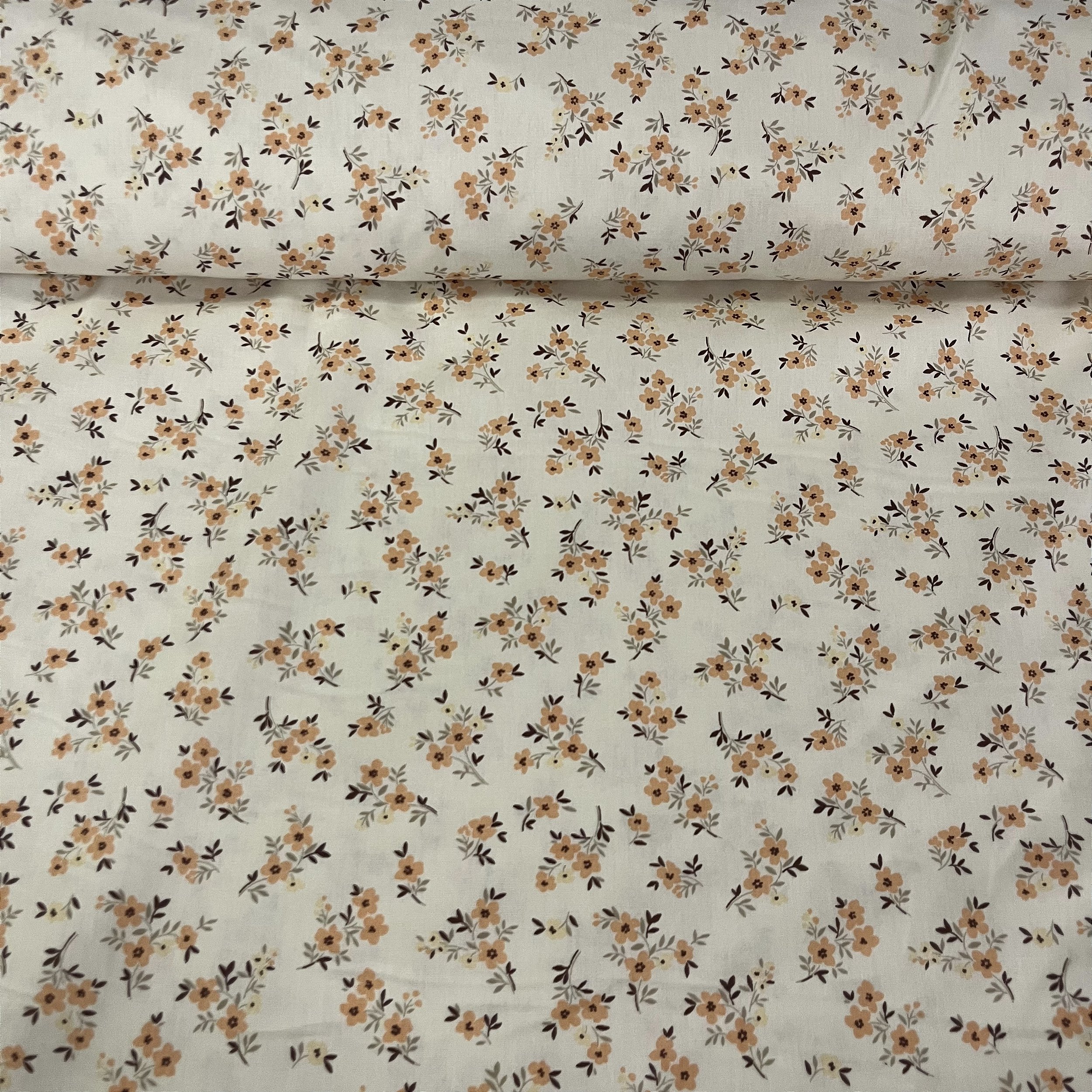 Tricoline Estampada Bahamas Fundo Bege Com Florzinhas Laranjas E Amarelas