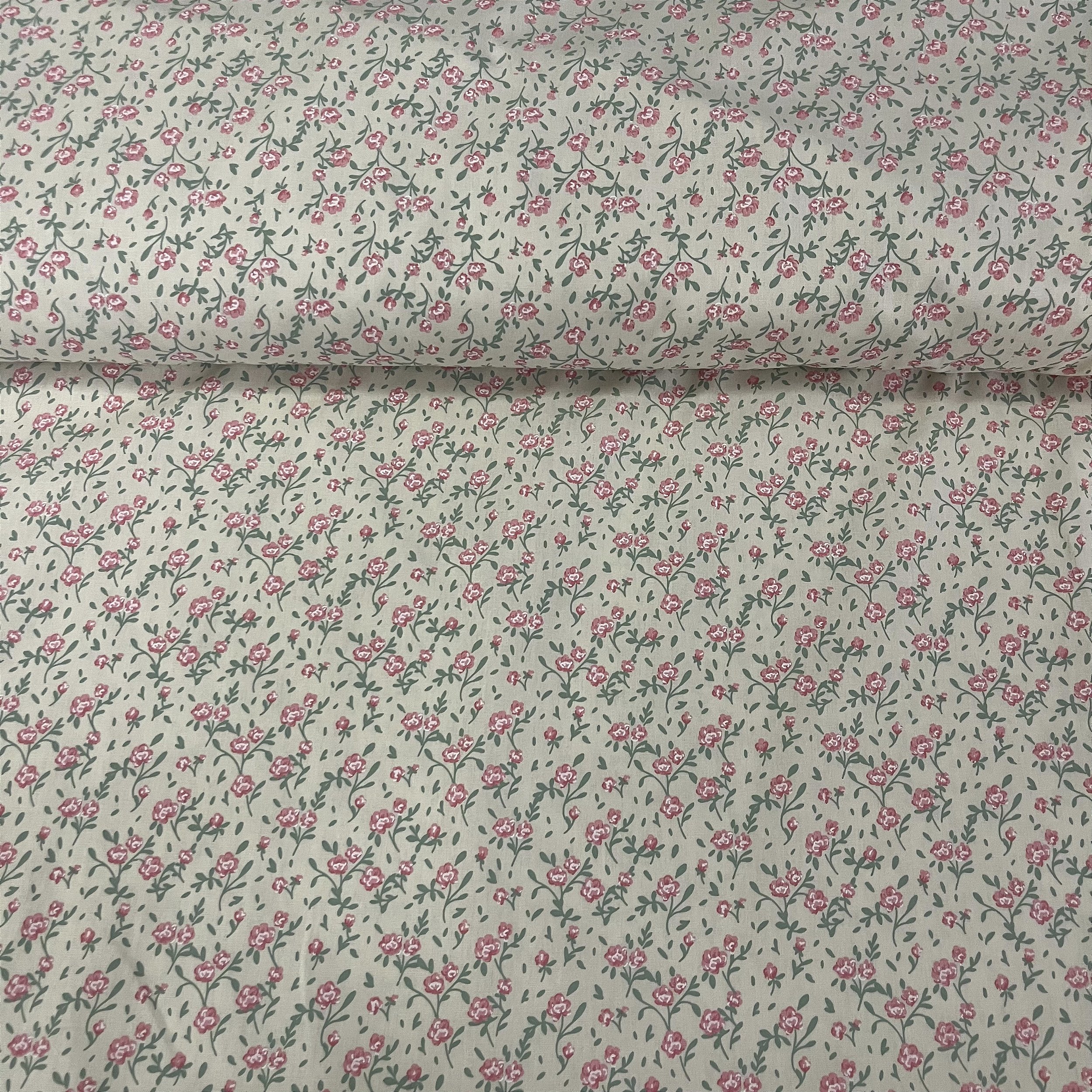 Tricoline Estampada Bahamas Fundo Marfim Com Flores Rosas e Folhas