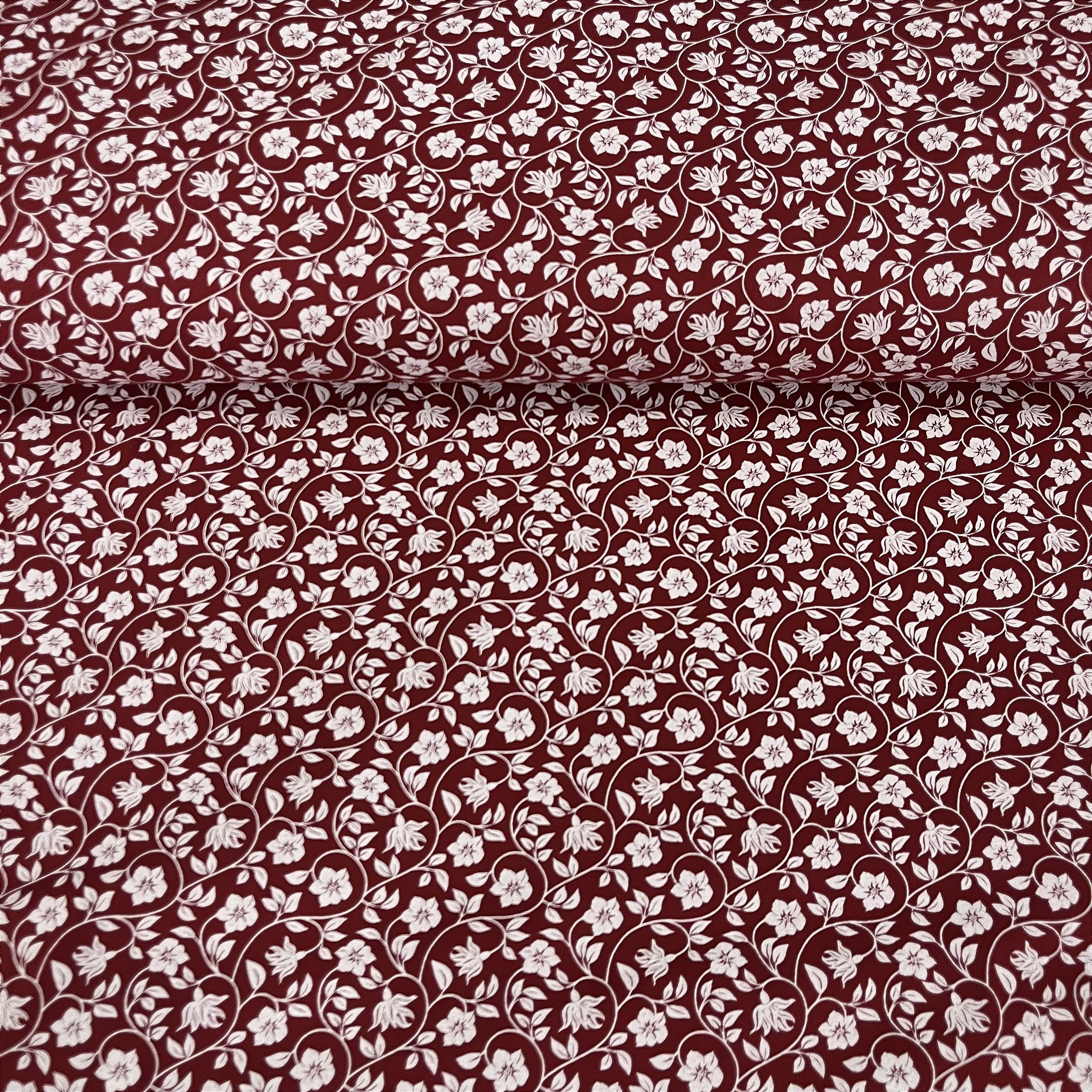 Tricoline Estampada Bahamas Fundo Vermelho Com Flores e Ramos Brancos