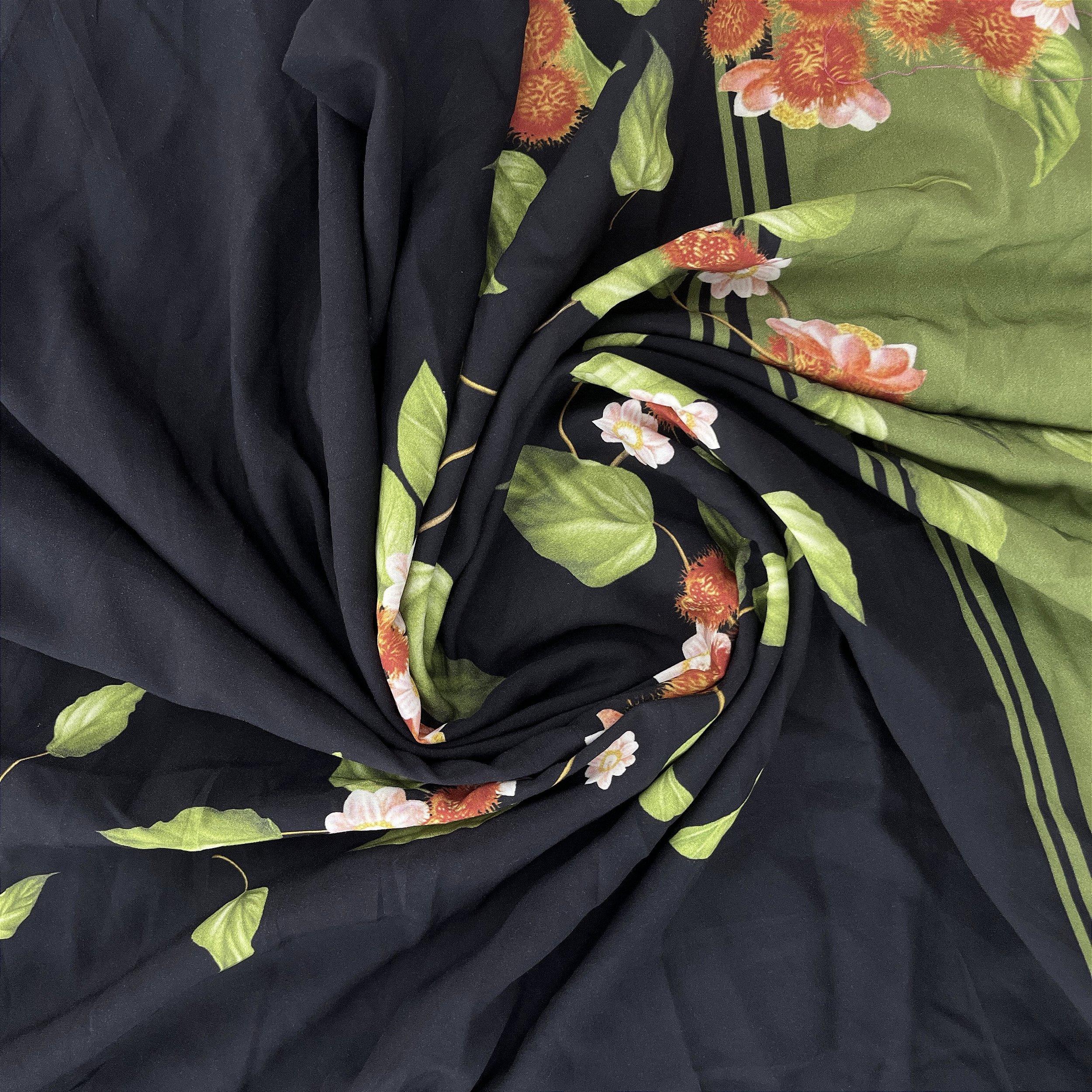 Viscose Barrada Estampada Fundo Preto Com Flores e Detalhes Verdes 1,35x1,70m